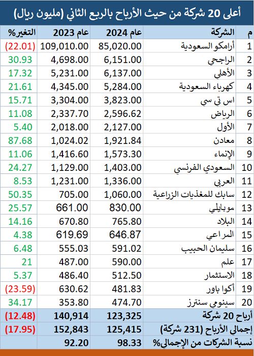 ووفقا لإحصائية "مباشر"، بلغت الأرباح المجمعة لأعلى 20 شركة من حيث الأرباح 123.33 مليار ريال، بالربع الثاني من عام 2025، تمثل 98.33% من إجمالي أرباح الشركات المدرجة في "تداول".