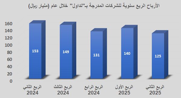 وسجلت أرباح الشركات السعودية بالربع الثاني من العام الحالي، أقل أرباح فصلية منذ الربع الثاني من العام الماضي (خلال عام)، وكانت أرباح الربع الثاني من عام 2024 هي الأعلى خلال تلك الفترة والتي بلغت نحو 153 مليار ريال.