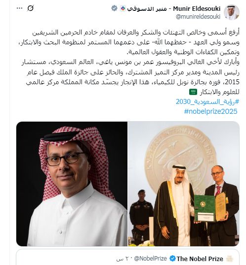 وقال الدسوقي، إن فوز "ياغي" بجائزة نوبل يجسد رؤية القيادة في أن تكون المملكة مركزًا عالميًا للعلم والمعرفة والابتكار، ويؤكد أن الاستثمار في العقول المبدعة هو الطريق لبناء مستقبلٍ مستدامٍ للإنسانية، حيث تمثل ابتكاراته في تصميم وإنتاج مواد نانونية واستخدامها لاستخلاص المياه من الهواء؛ نموذجًا مُلهمًا لما يمكن أن يصنعه العلم حين يجتمع الشغف بالإصرار.