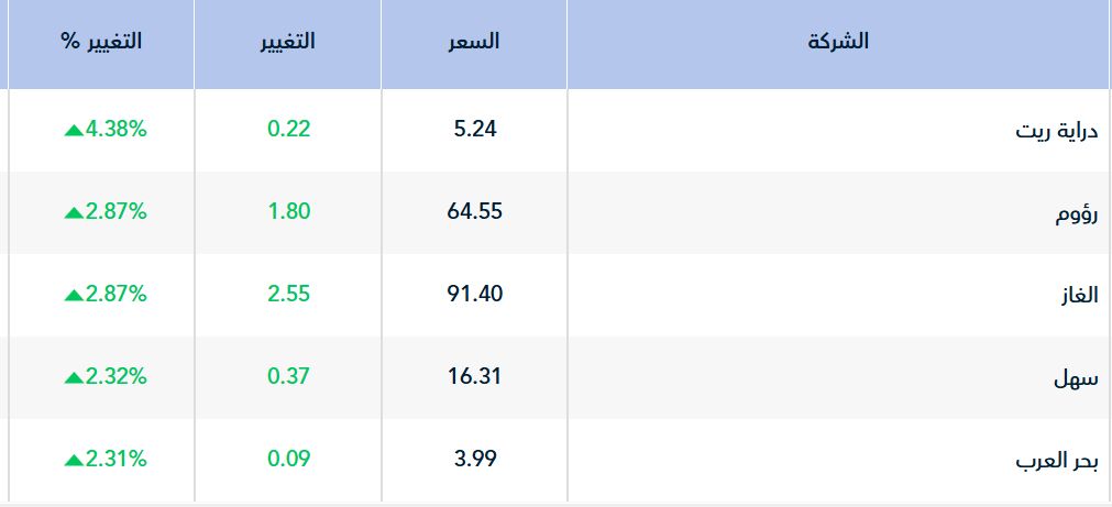 فى المقابل شهد 152سهمًا أداءًا إيجابيًا، بصدارة سهم "دراية ريت" الذى ارتفع بنسبه 4.38%، تلاه سهم "رؤوم" بارتفاع نسبته 2.87%.