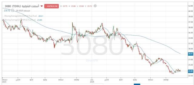 مباشر للأبحاث: يتداول سهم أسمنت الشرقية ضمن اتجاه هابط واضح على الإطار الزمني اليومي، في ظل استمرار الضغوط البيعية خلال الفترة الأخيرة، بعد كسر دعم محوري عند 25.05 ريال، إلى جانب التداول دون المتوسط المتحرك؛ ما يؤكد سيطرة القوة البيعية على حركة السهم.