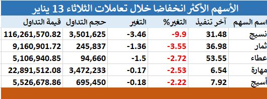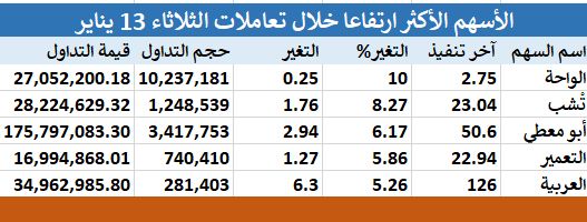 144 سهماً مرتفعا بتعاملات الثلاثاء.. "الواحة" يتصدر الارتفاعات, اليوم الثلاثاء 13 يناير 2026 05:13 مساءً