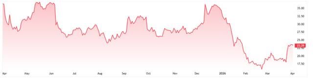 وأغلق السهم جلسة أمس عند 23.60 دولارًا، فيما استهل تداولات ما قبل الجلسة قرب 23.64 دولارًا.