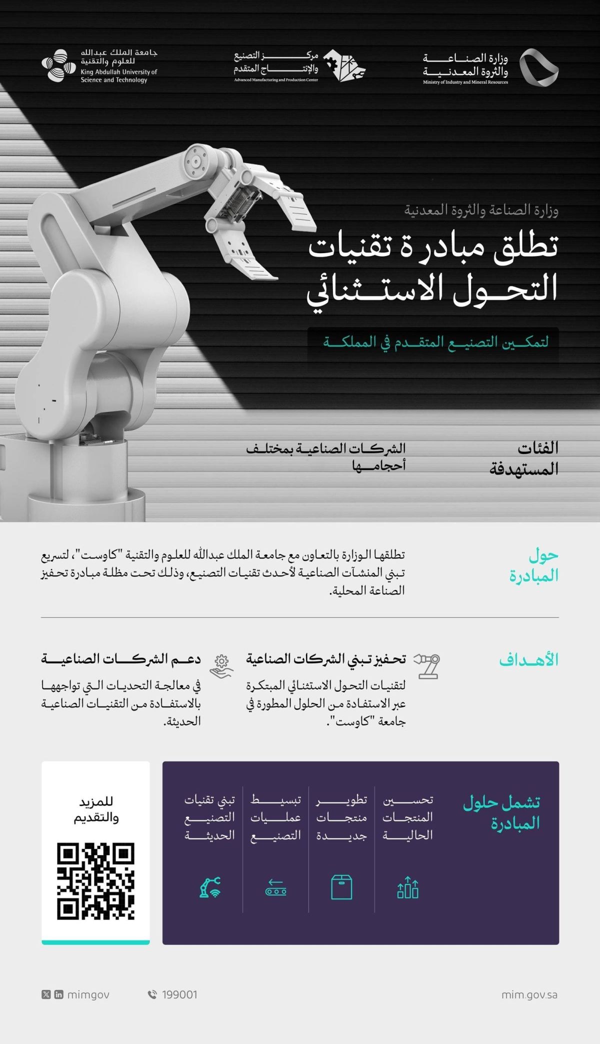أطلقت وزارة الصناعة والثروة المعدنية، بالتعاون مع جامعة الملك عبدالله للعلوم والتقنية (كاوست)، مبادرة «تقنيات التحول الاستثنائي»، التي تهدف إلى تسريع تبني الشركات الصناعية لأحدث تقنيات التصنيع المتقدم، ودعمها بحلول مبتكرة ترفع كفاءة إنتاجها وتعزز تنافسيتها إقليميا وعالميا، وذلك ضمن جهود الوزارة المستمرة لتمكين التحول الصناعي في المملكة.