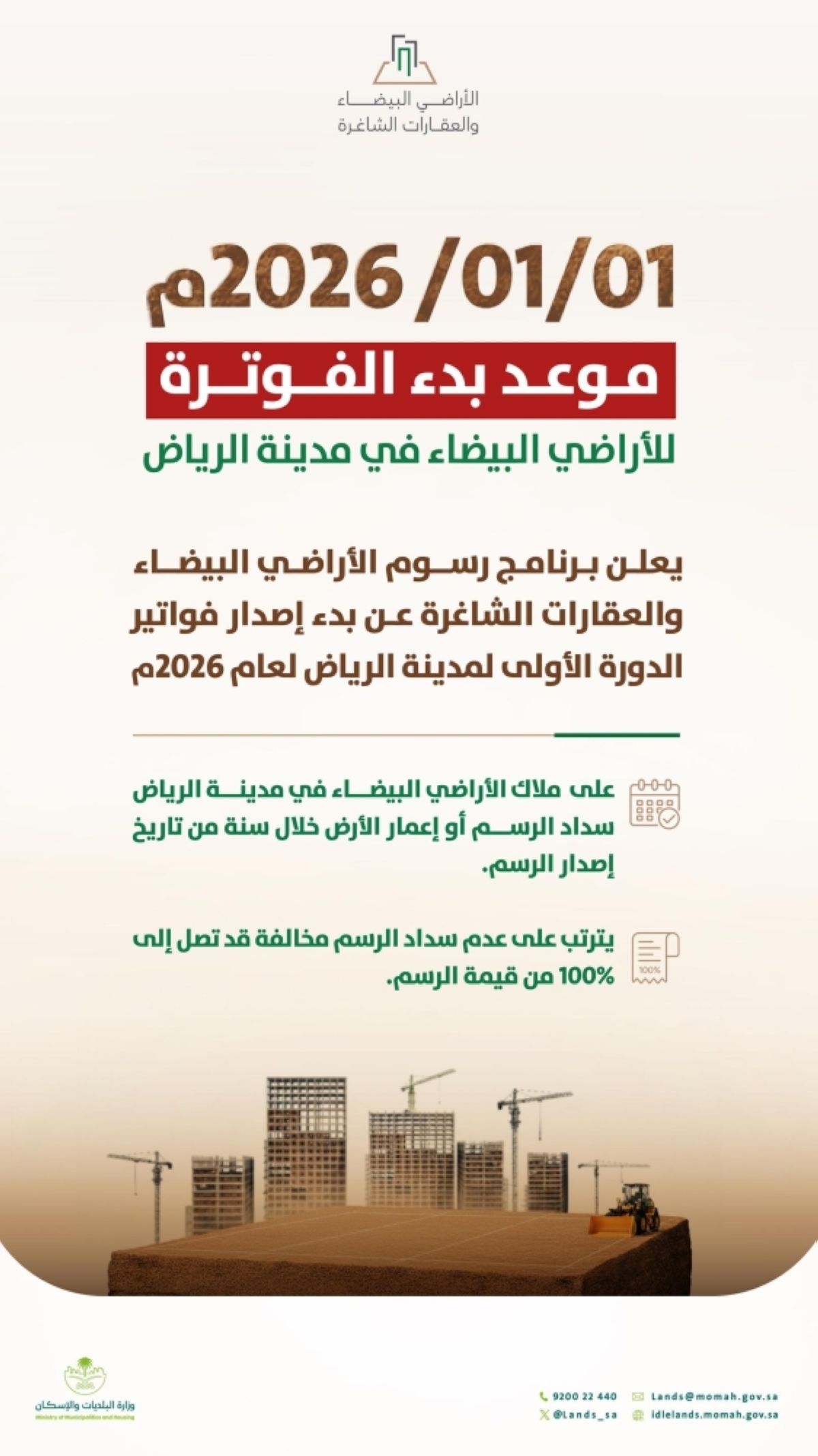 «البلديات والإسكان» تبدأ بإصدار +60 ألف فاتورة لرسوم الأراضي البيضاء, اليوم الأحد 4 يناير 2026 01:41 صباحاً