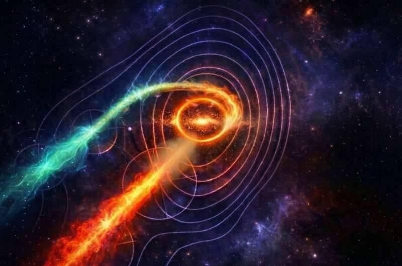 وأظهرت النتائج وجود «نفثتين» من الجسيمات بدلاً من واحدة، حيث تدور النفاثة الثانية بحركة مغزلية عكس اتجاه عقارب الساعة حول الثقب الأسود الأكبر، مما يؤكد رقصة الموت الكونية بين العملاقين اللذين يدوران حول بعضهما بعضا مرة كل 121 يوماً فقط.