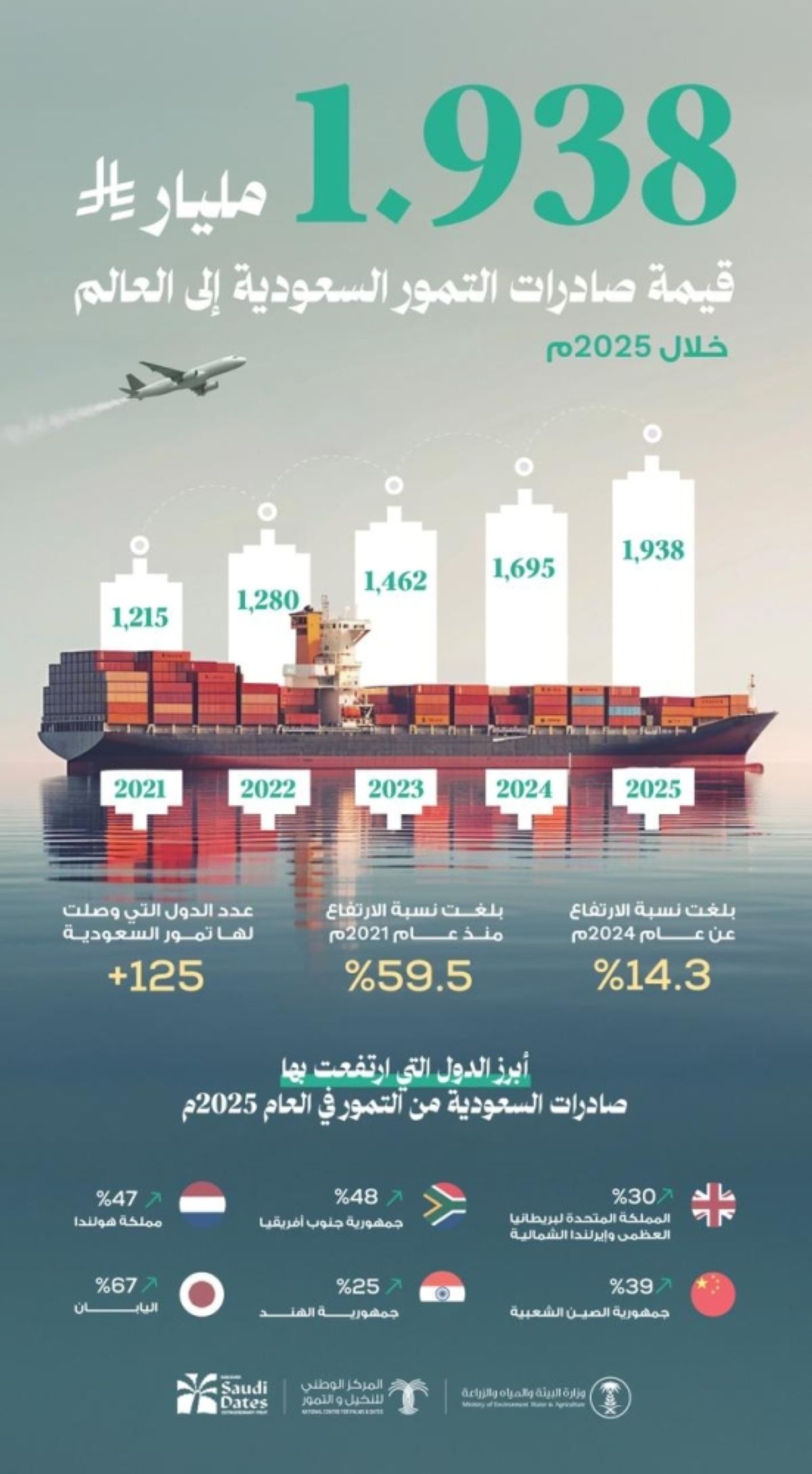 المملكة تحقق نموا قياسيا في قيمة صادرات التمور السعودية بنحو ملياري ريال, اليوم السبت 25 أبريل 2026 08:31 مساءً